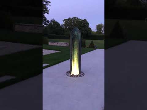 The client wanted the sound of flowing water so we created a water feature . The lighting looks dramatic and creates a flame like glow when the water hits the pool.